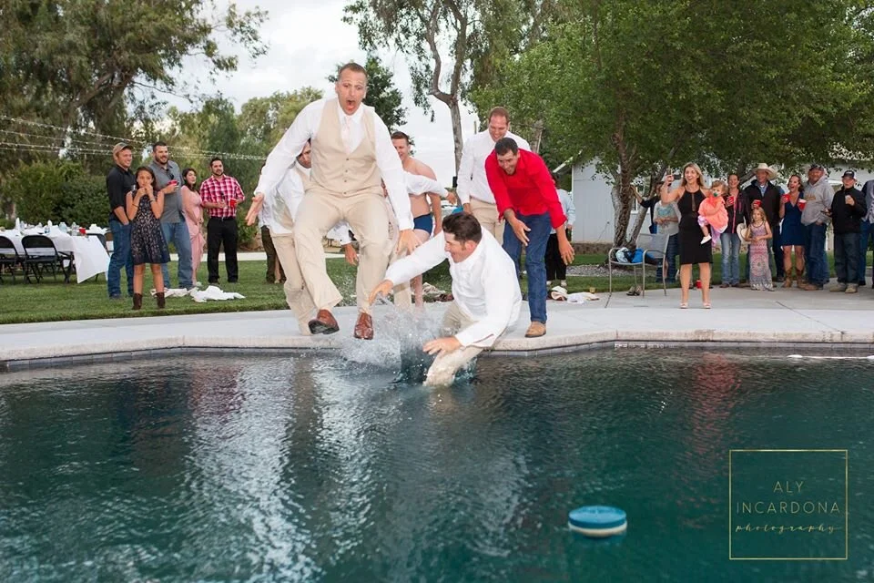 I show up the day of and as I am unload all my gear I look over and what do I see? Oh, just an entire Pig looking right at me. Wait, what? Yes, I said it. An entire pig getting put onto a spit lover the fire and it was turned all day long. Ok, that was eye opening. I have never seen meat cooked like that. We go in to start portraits and all the groom and groomsmen were already hammered. Fun, SO FUN, but hammered. As the long hot summer wedding day went on, the drinks were endless and the guys took full advantage of that. They were a hoot. We got through the formalities with only one fall front he groom during the first dance. We finally cut the cake and its time for open dancing and the best man sprints across the dance floor to the maid of honor, picks her entirely up, runs and jumps into the POOL! Yes, the pool. Then the entire bridal party loves the idea and all of them and some guests decide to do the same. We wrapped up after that, we could not believe our eyes. It was the most fun, crazy wedding I had ever been to.